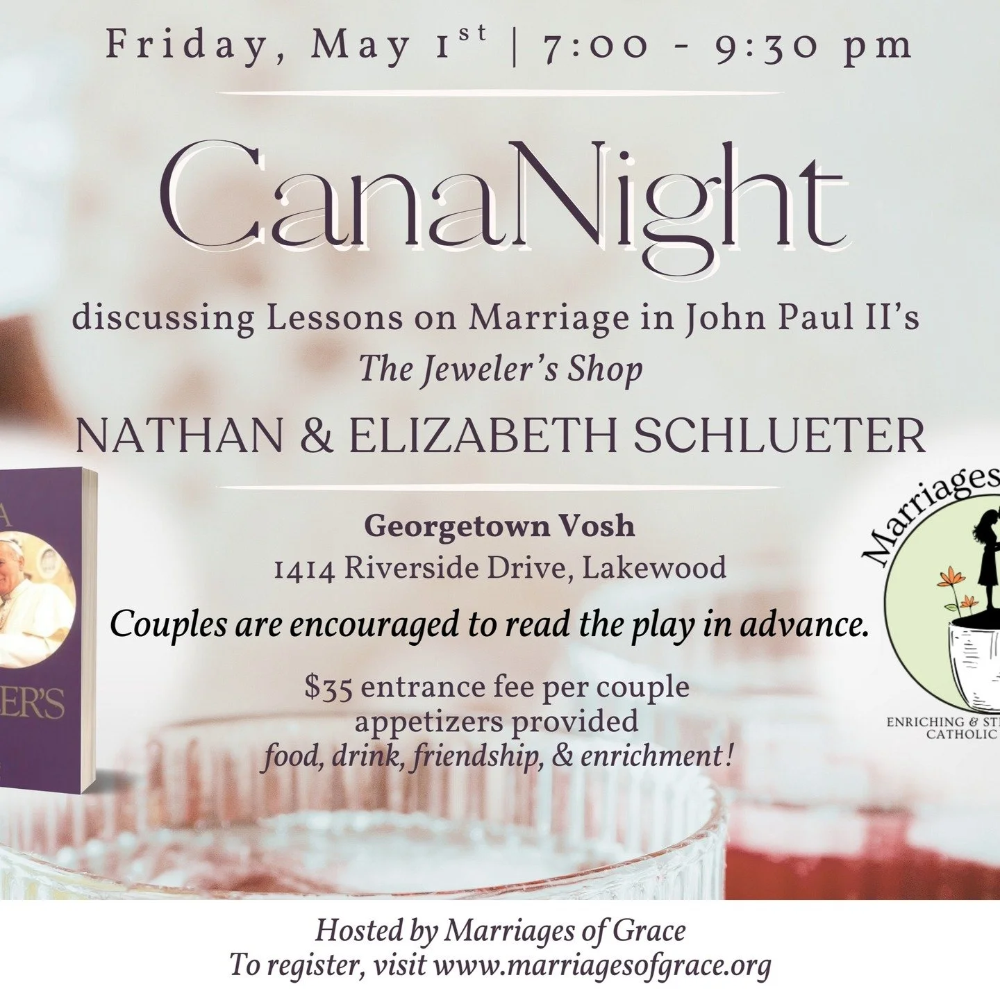 Our world needs joy-filled marriages that reflect the beauty of the Catholic Church’s vision of sacramental marriage. Marriages of Grace provides opportunities for Catholic engaged and married couples to be enriched and strengthened on their path of holiness. Join Marriages of Grace at an upcoming event. We look forward to meeting you!